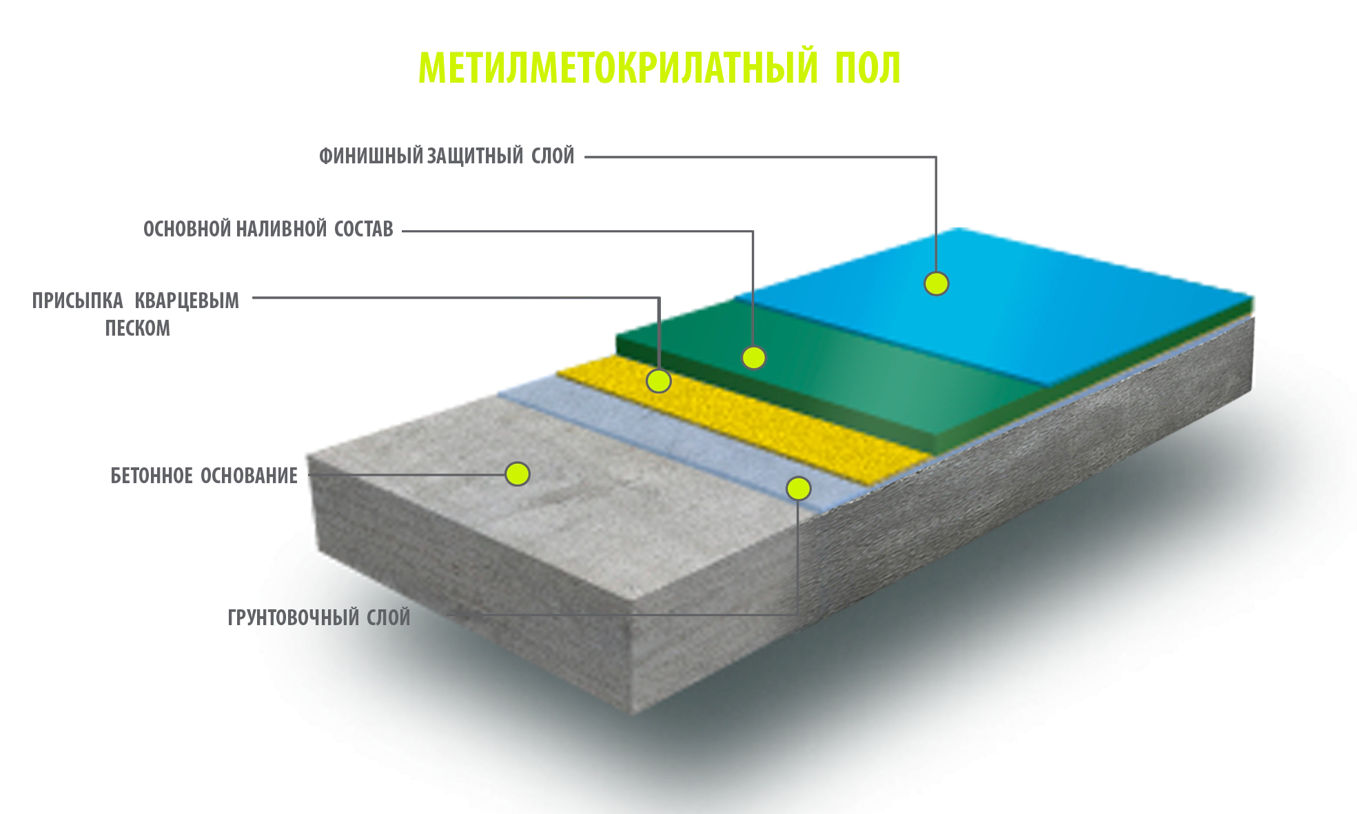 Бесшовное наливное покрытие из метилакрилатной смеси – популярный состав для полов в медицине, офисах, складах, спортивных и выставочных залах. Метилакрилатные покрытия выполняются тонкослойными и высоконаполненными, толщиной от 0,5 до 16 мм.
