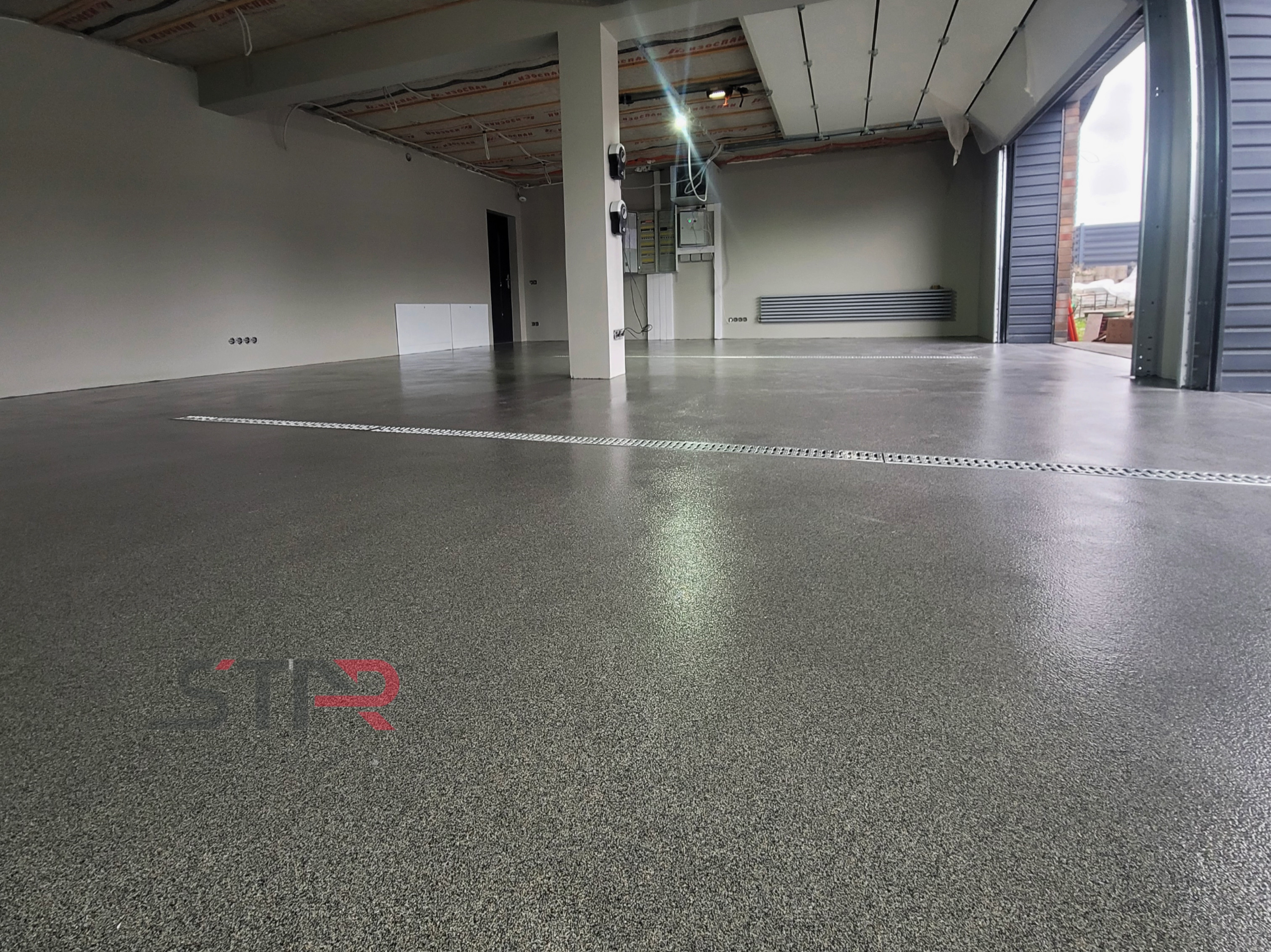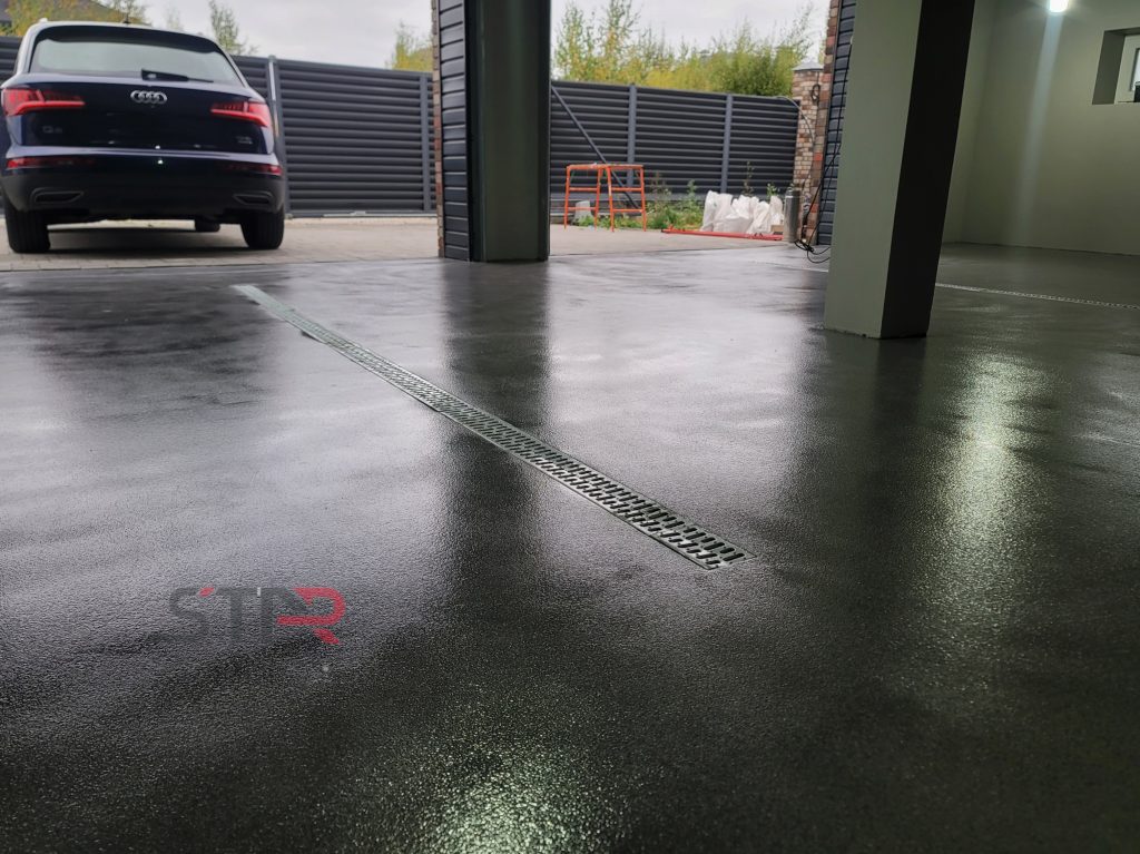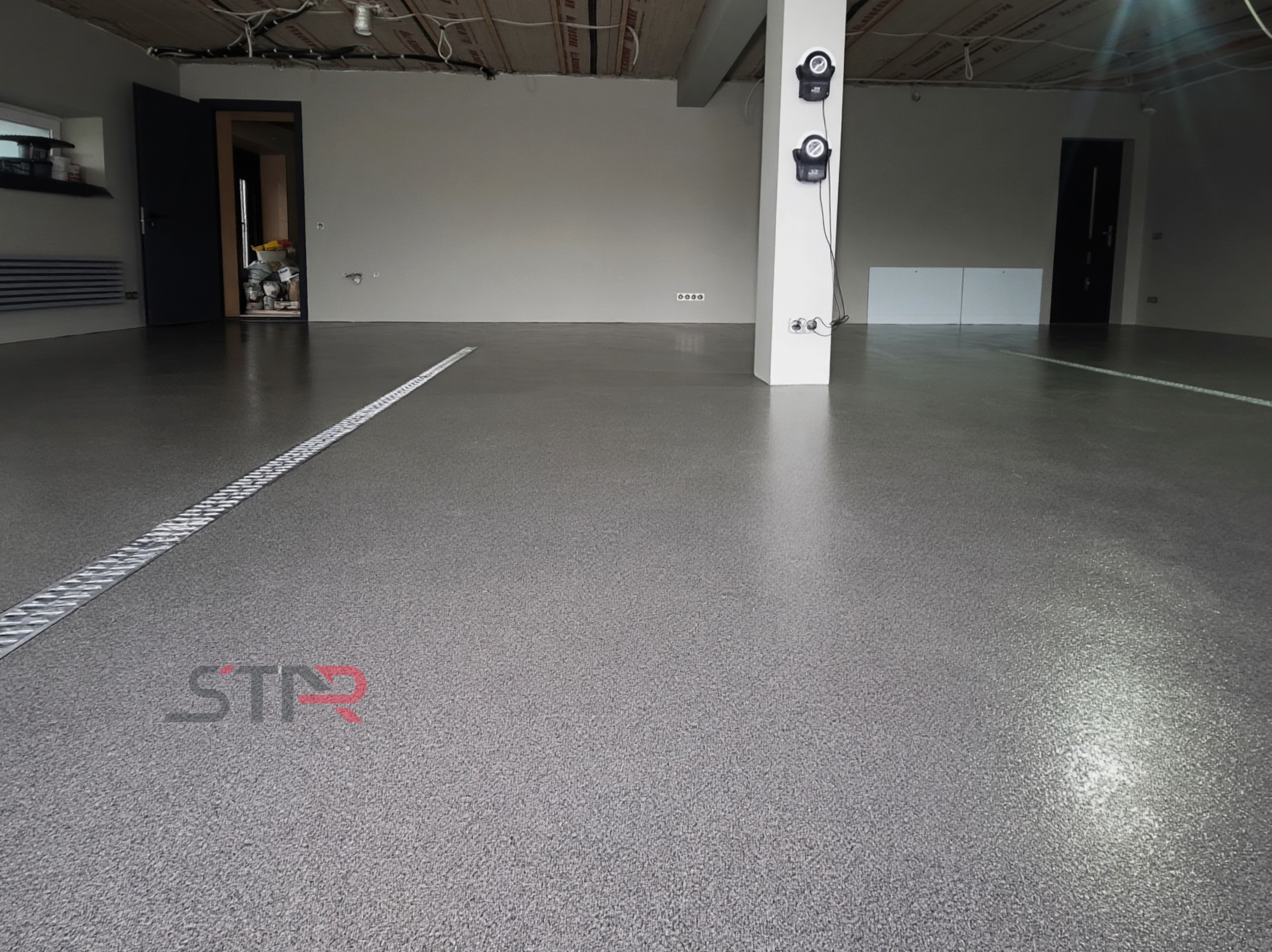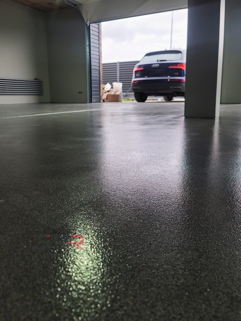 Выполнили работы по устройству пола в частном гараже. Вместо обычного бетона, который пылит и быстро пачкается, заказчик получил современное эпоксидное покрытие «Флоковый ковёр» с супер мелким зерном.