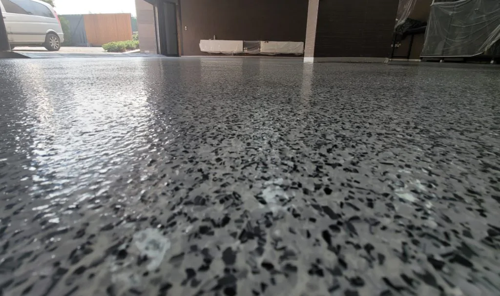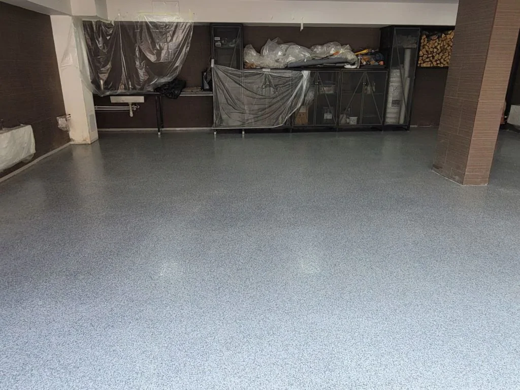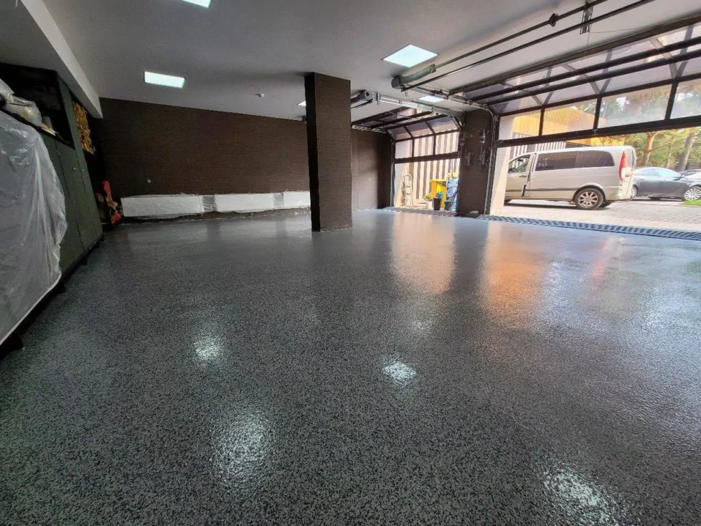Современный гараж с эпоксидным флоковым покрытием на полу, которое идеально сочетается с функциональностью и эстетикой. Это флоковое покрытие помогает поддерживать чистоту и порядок в гараже, минимизируя впитывание грязи и жидкости, что особенно важно для мест с интенсивной эксплуатацией. Флоковый ковер в данном гараже не только защищает поверхность от повреждений и загрязнений, но и добавляет современный вид интерьеру, улучшая освещенность и создавая визуально чистое и ухоженное пространство. Покрытие легко моется и обладает отличными шумопоглощающими свойствами, что делает его идеальным выбором для гаража