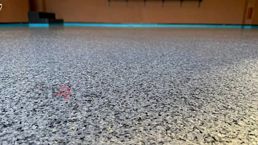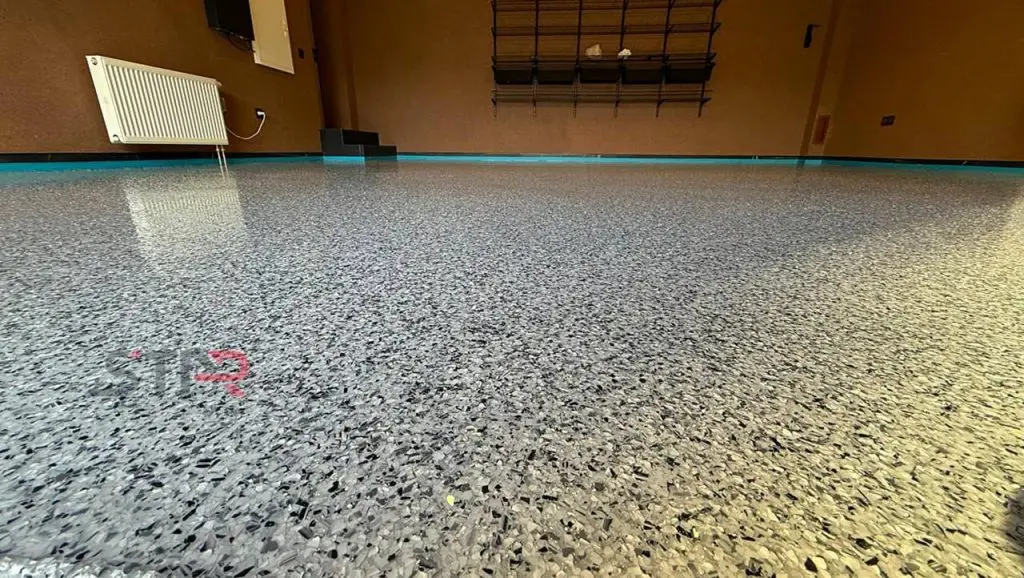 Для этого объекта мы сделали наливной пол по технологии «флоковый ковер» — современное декоративное решение на основе эпоксидной смолы с добавлением флоков (декоративных чипсов).