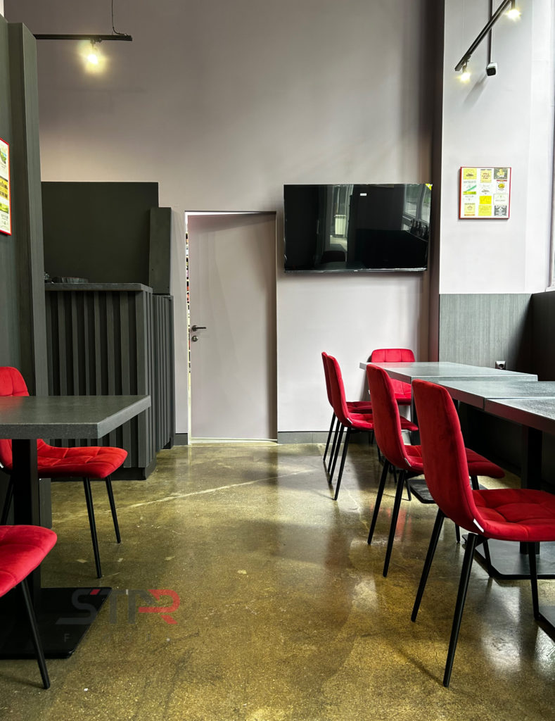 Цель — укрепить основание пола, повысить износостойкость покрытия и упростить уход за поверхностью в условиях общественного заведения с высокой проходимостью.