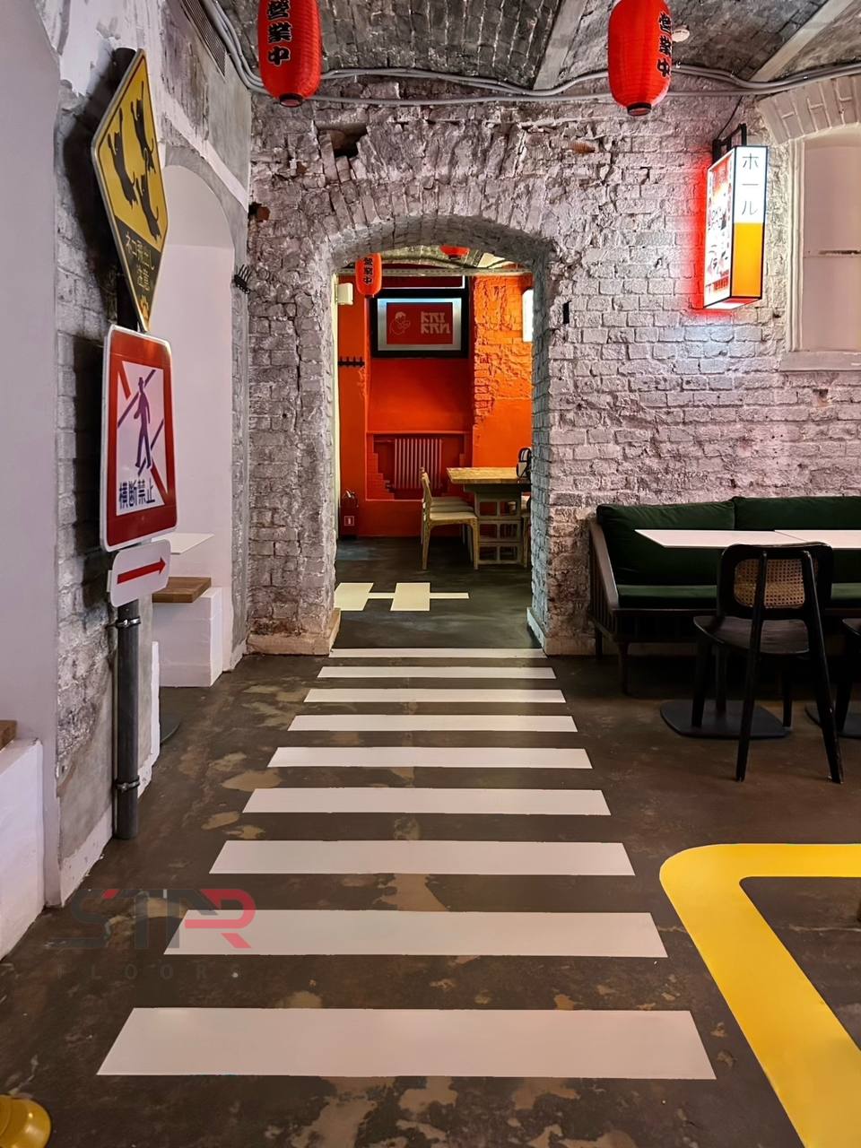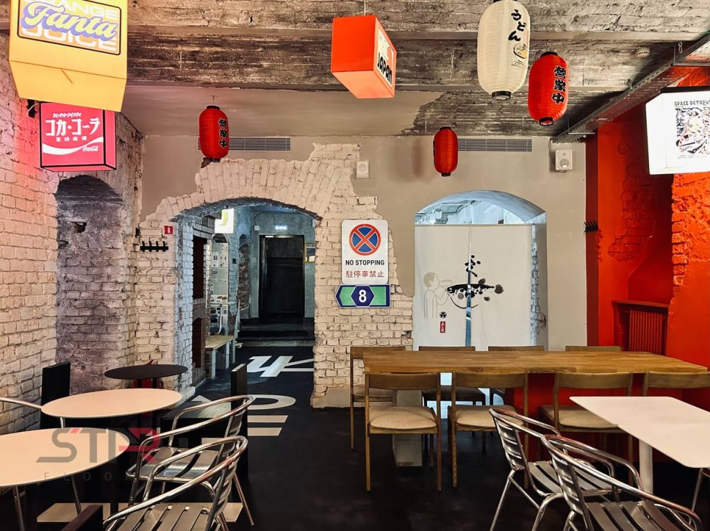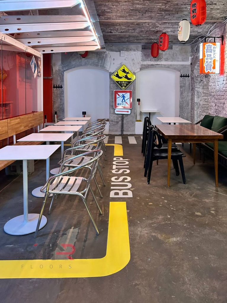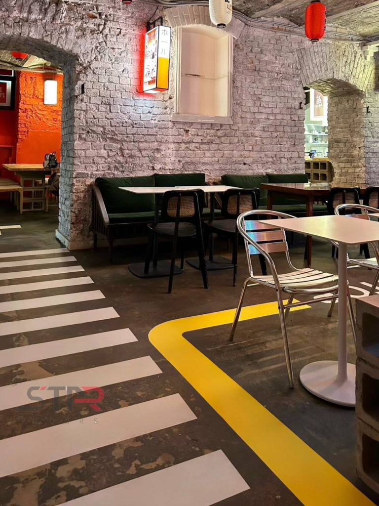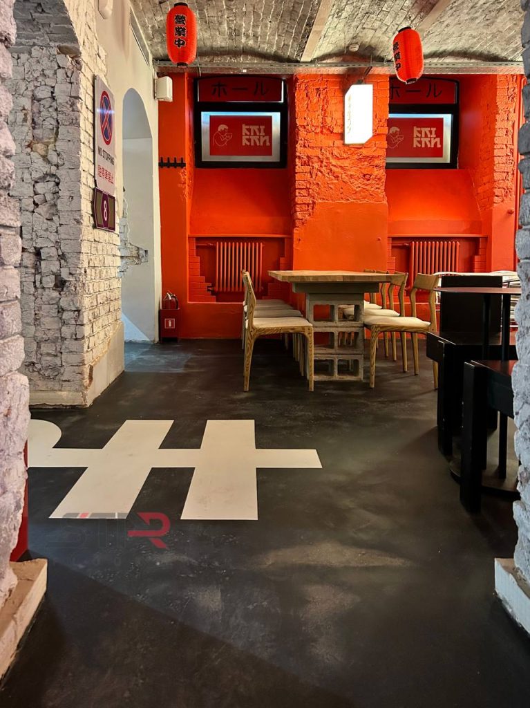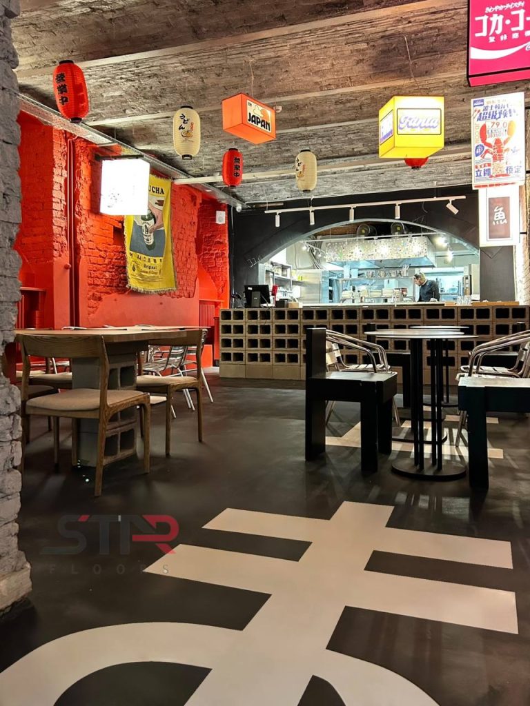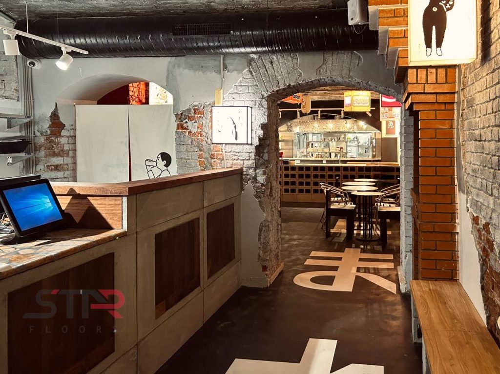 Для бетонных полов ресторана мы выполнили обработку эпоксидной пропиткой — это базовое, но крайне важное решение для помещений, где ценится чистота и долговечность.