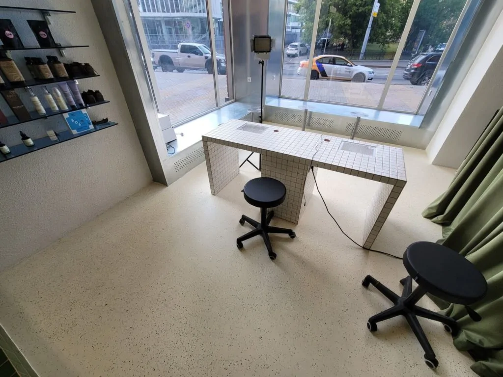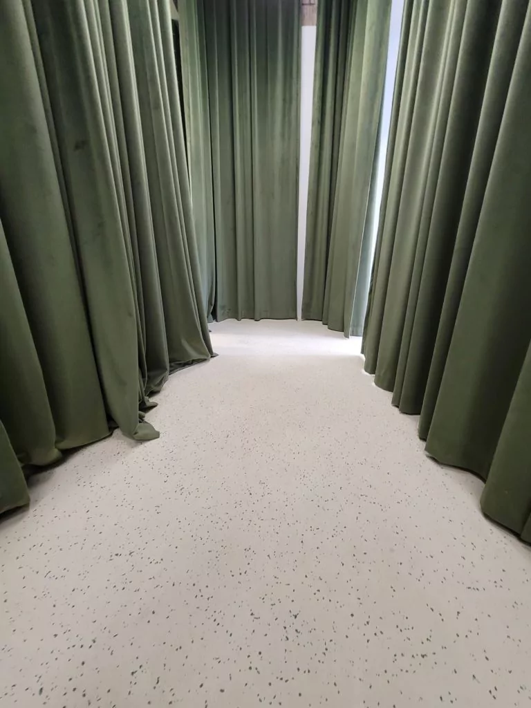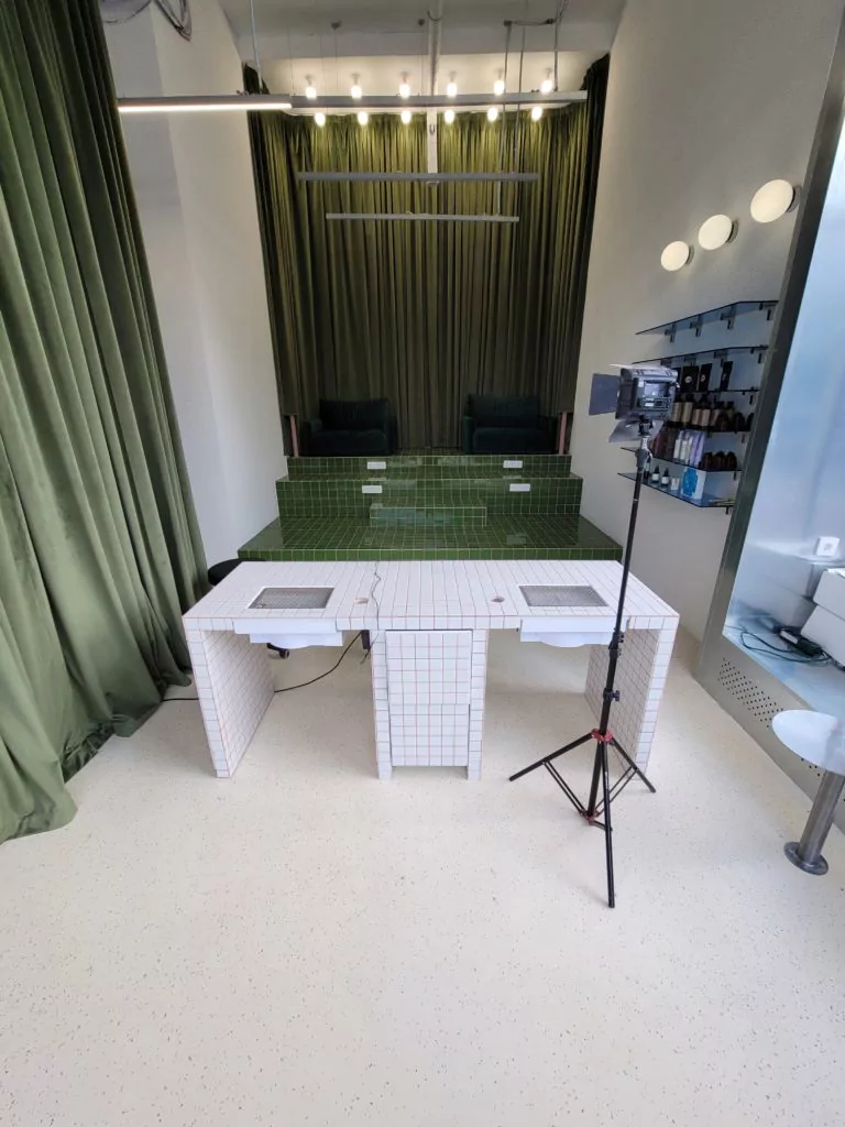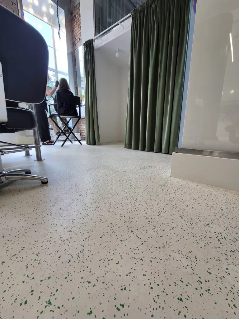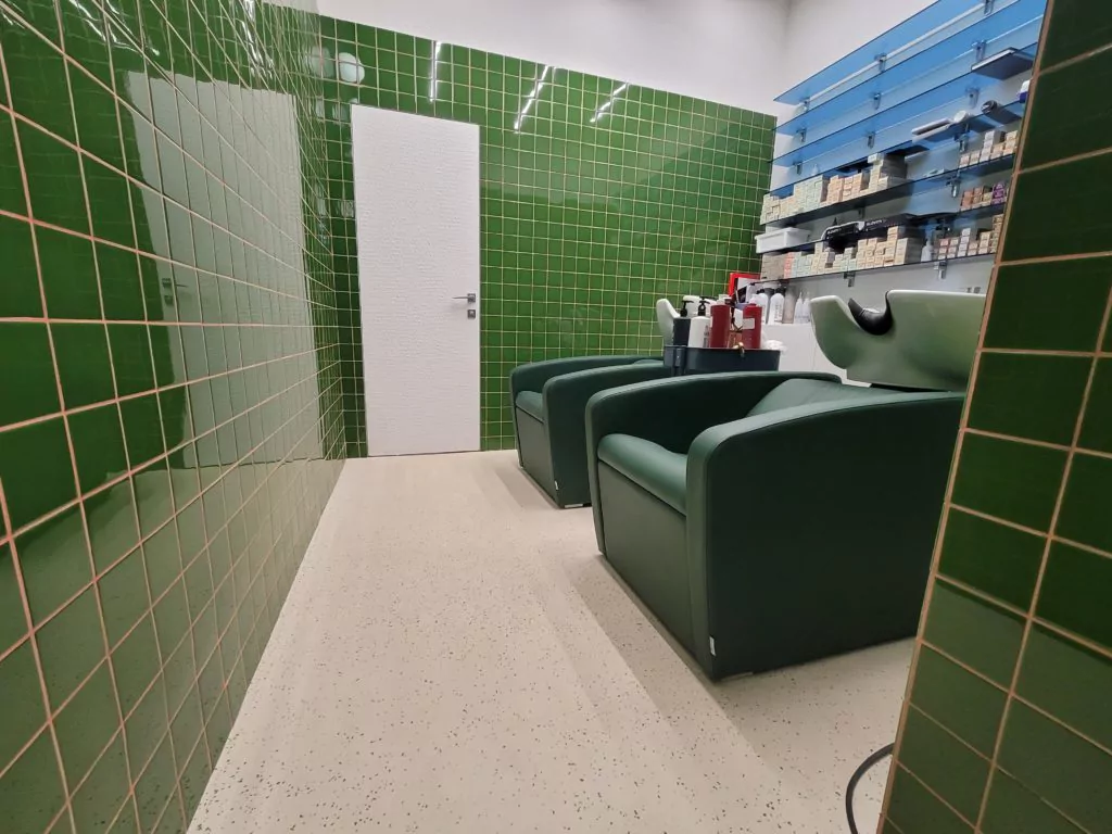 Салона красоты «Сон», где эпоксидное покрытие пола играет ключевую роль в создании стильного и практичного пространства. Эпоксидный пол в светлых тонах прекрасно гармонирует с яркими зелеными плитками и современными элементами мебели, создавая спокойную и расслабляющую атмосферу для клиентов.