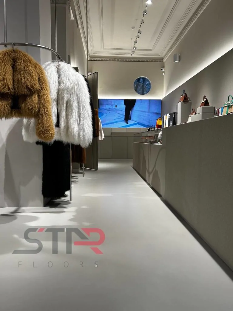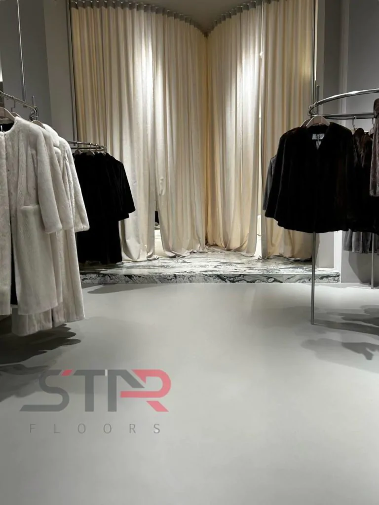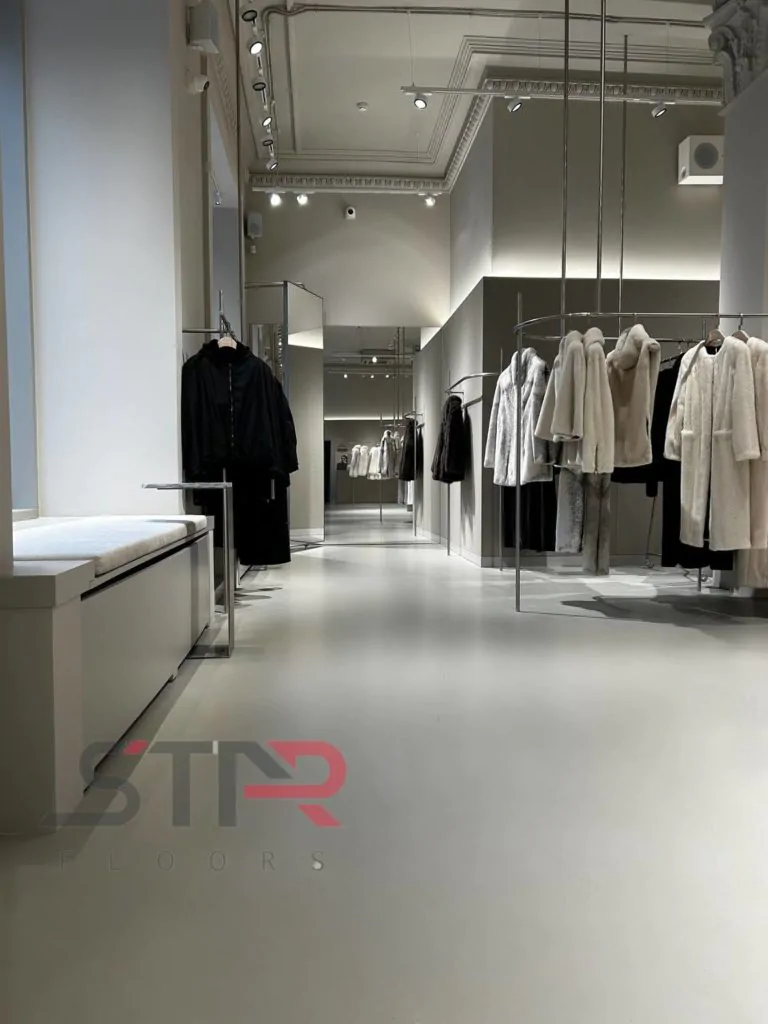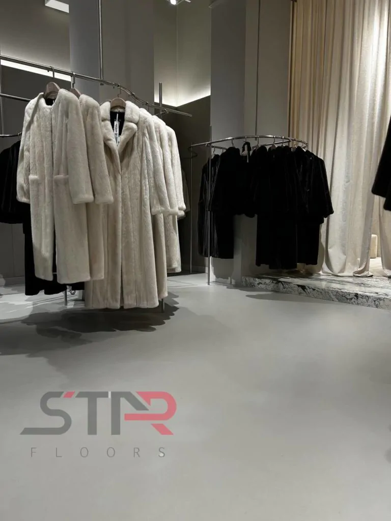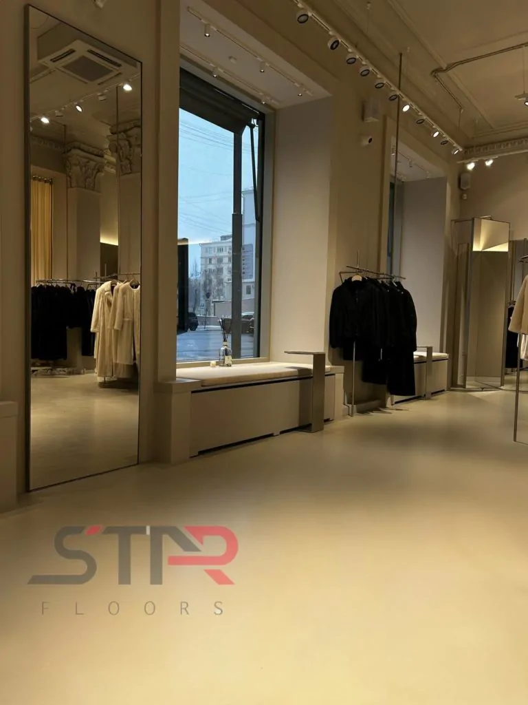 Гладкая, бесшовная поверхность создает эффект монолитности, добавляя интерьеру глубину и отражая эстетику бренда. Покрытие устойчиво к нагрузкам, не боится влаги и легко очищается, что делает его идеальным выбором для коммерческих помещений.